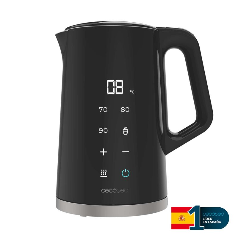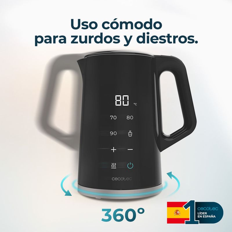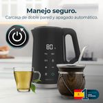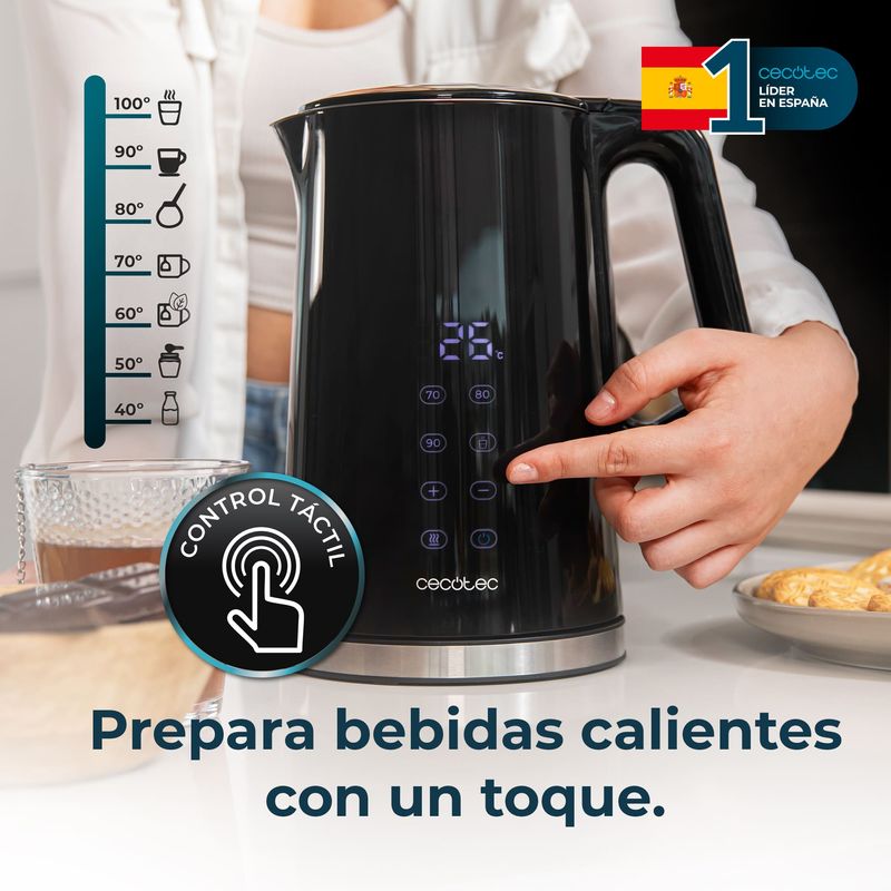 -Temperatura regulable: ajusta la temperatura en intervalos de 5ºC entre 40 y 100 ºC desde su pantalla táctil, o selecciona entre sus 4 niveles de temperatura preestablecidos: 70ºC (té verde), 80ºC (té o mate), 90ºC (café), 100ºC (hervir).