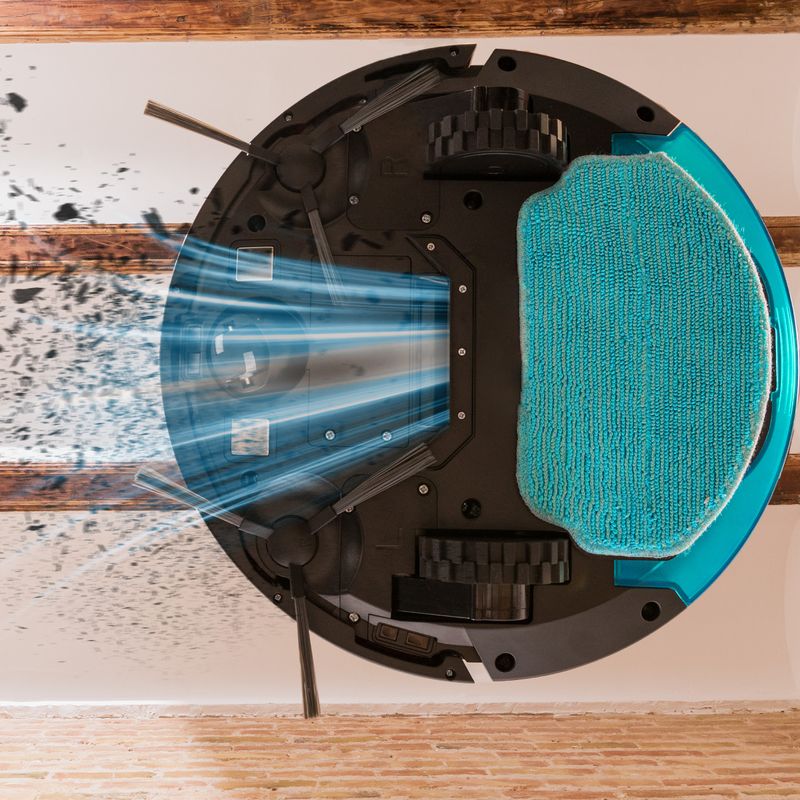 Robot aspirador de gran succión, con sensores de movimiento. 5 en 1: barre, aspira, pasa la mopa, friega y seca el piso. Sistema All-TimeTable.