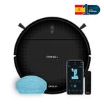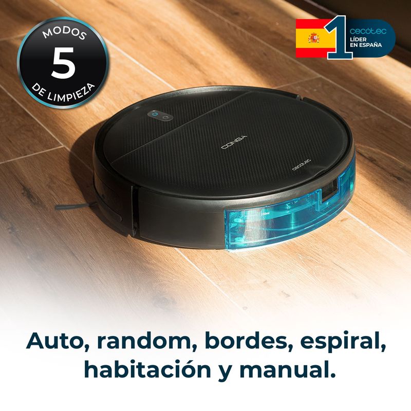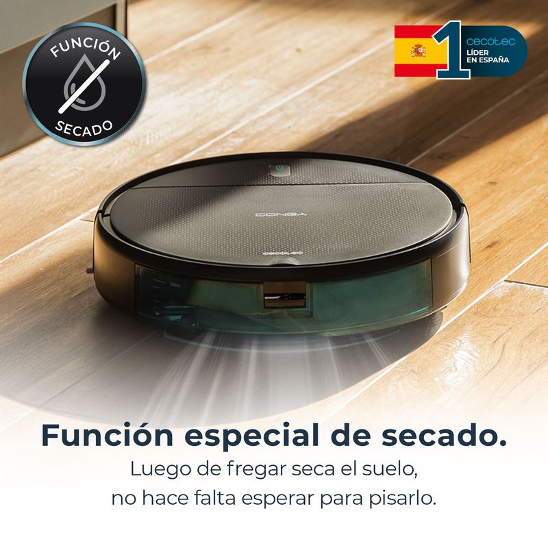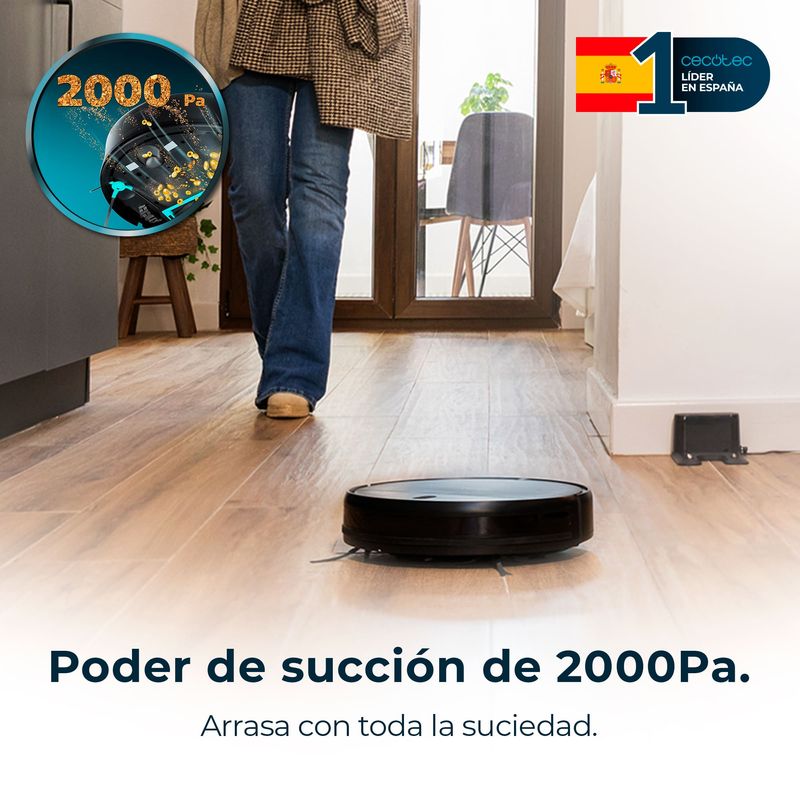 Robot aspirador con navegación giroscópica para una limpieza total de la casa. Motor de succión de 2000 Pa. 2 cepillos laterales.Mopa de fregado. Autonomía de 120 minutos. Control con APP de CECOTEC y con mando a distancia. Conectividad WiFi 2,4 GhZ y Bluetooth.