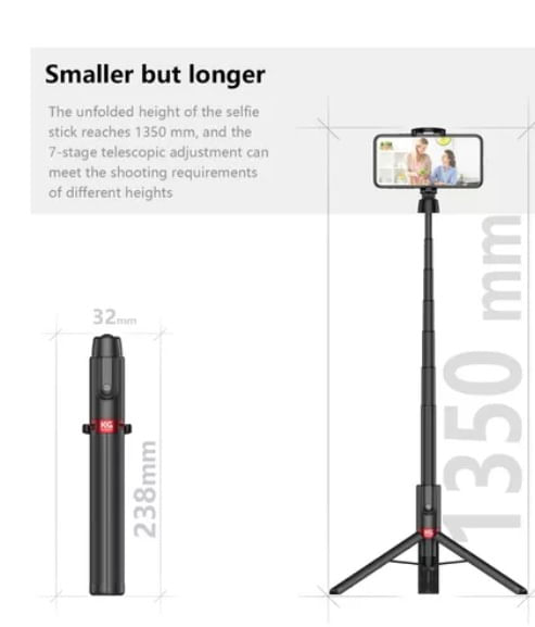 - Diseño 3 en 1: selfie stick + trípode + control remoto Bluetooth
